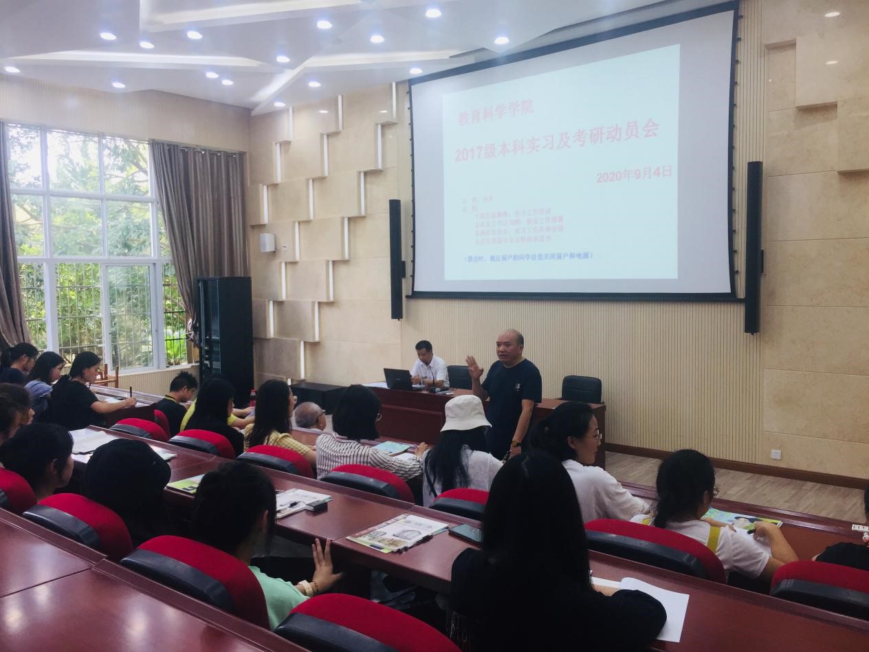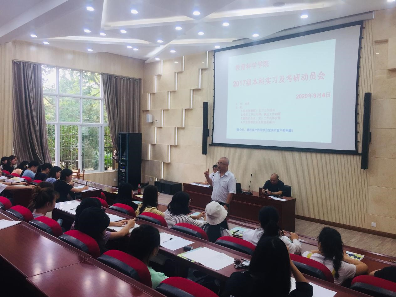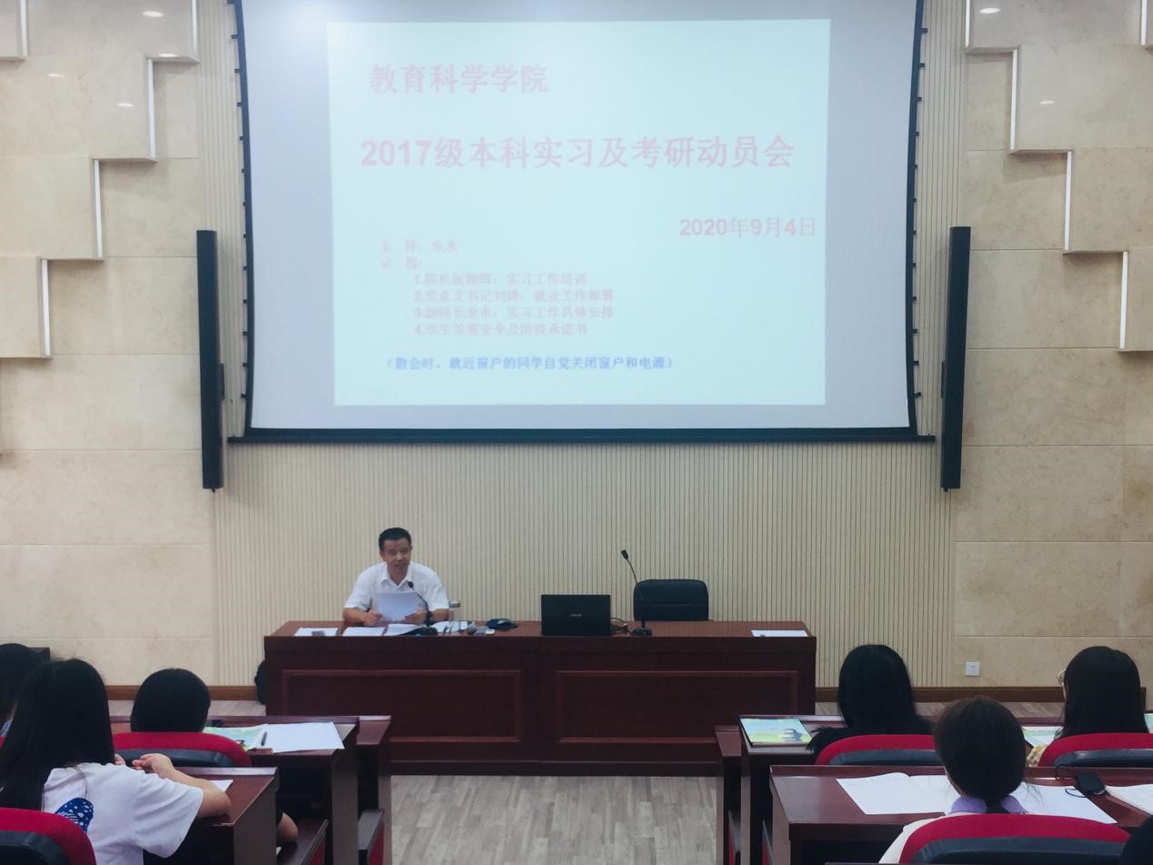 为做好2017级bevictor伟德官网小学教育、学前教育、应用心理学三个本科班的培养工作,加强同学们的实践能力,提高同学们的教学技能,bevictor伟德官网于2020年9月4日(周五)14:30,在二教2105教室开展了“2017级实习及考研动员大会”。bevictor伟德官网党总支书记刘烨、经理阮朝辉、副经理余水、各专业教研室主任以及17级全体员工出席了本次动员大会。