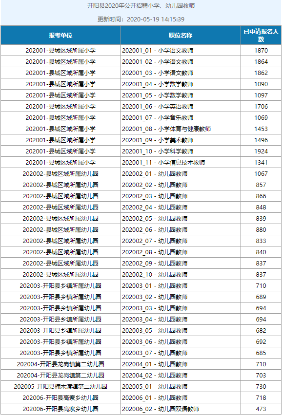 报名期间,考生登录报名系统,可查询每个岗位的报名情况,供报名人员参考。报名结束后,县招聘工作办公室将在“开阳县人民政府门户网站”上公布本次招聘各岗位报名情况。