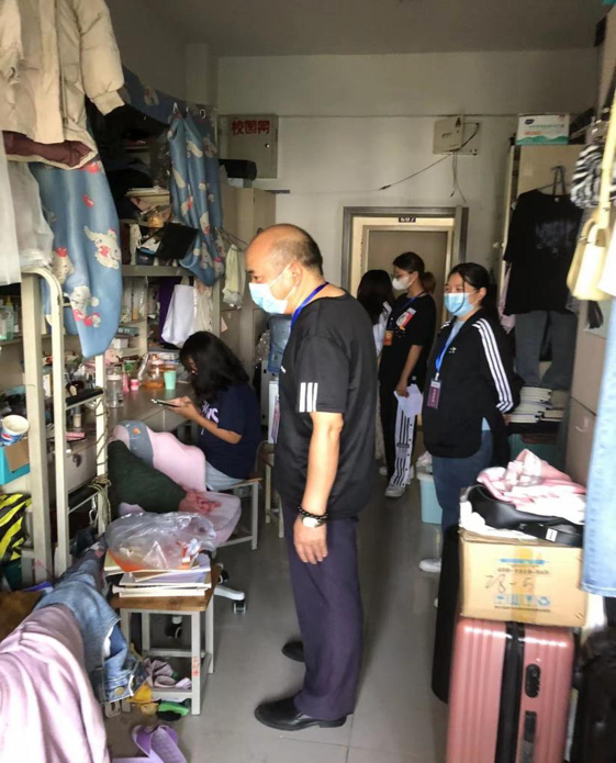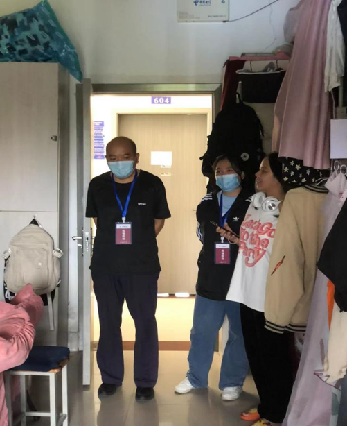 在检查宿舍过程中,阮朝辉经理与辅导员时钰雪检查员工在疫情防控下的基本情况,认真询问了同学们的生活情况与本学期课程学习安排情况,了解员工思想动态;对宿舍安全进行全面检查,重点检查了用电、用水的安全以及卫生情况。辅导员认真核查宿舍人员变化情况,围绕员工身心、学习、生活状态等问题与同学们进行了深入交流,要求宿舍成员要友爱互助,重视安全、卫生,树立优良寝风,在疫情防控中也不能懈怠学习要尽快投入学习,适应疫情防控下的特殊情况。