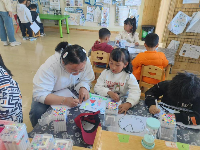 游戏活动结束后,幼儿回到班级开始对自己的建构游戏进行绘画表征,五名研究生观察幼儿的绘画过程,并与幼儿进行一对一倾听,理解尊重接纳幼儿的真实想法,给予幼儿适宜回应。