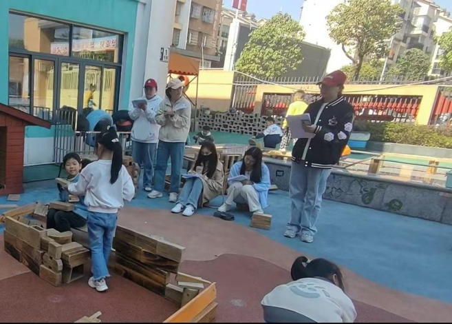 抵达幼儿园,我们对幼儿园环境基本熟悉后便开始对幼儿游戏进行观察。本次观察的重点是大三班幼儿建构区的积木建构游戏活动,旨在通过观察分析幼儿在游戏中的实际发展水平、行为表现、合作方式、创造力发展等,为后续的学习研究和实践教学提供实证基础。