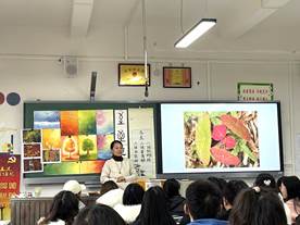 刘老师展示不同地区的秋季图景,向同学们讲述了树叶从嫩绿变黄,再变为深红的过程,它在秋季时绽放自己的光彩,最终落叶归根,化为尘土。刘老师说道:“树的生命是短暂的,但它却拥有属于自己的颜色,同学们也要像大树一样,找到自己的颜色,实现自己的人生价值。”