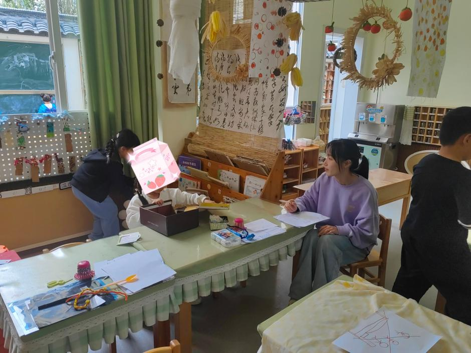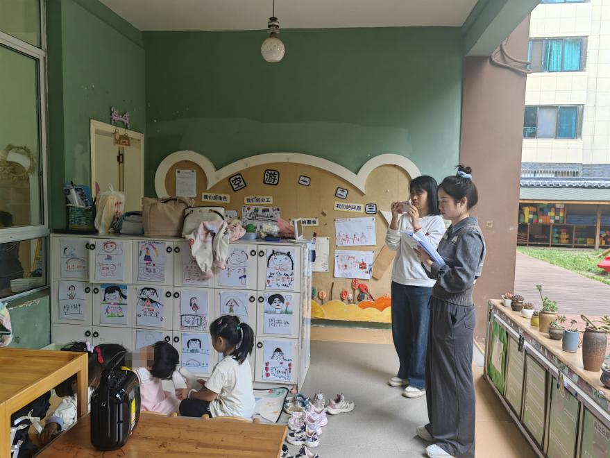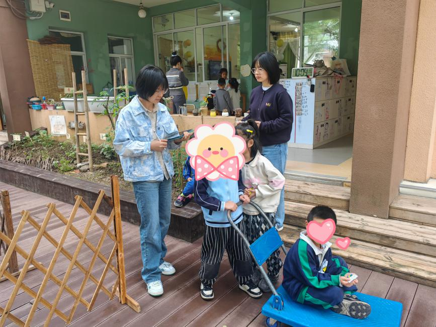 2023级硕士研究生刘天容和林美琦深入“快乐出租车公司”,观察到幼儿们扮演司机和乘客,利用推车模仿驾驶动作,体验驾驶的乐趣,在游戏中了解交通规则和乘车礼仪。